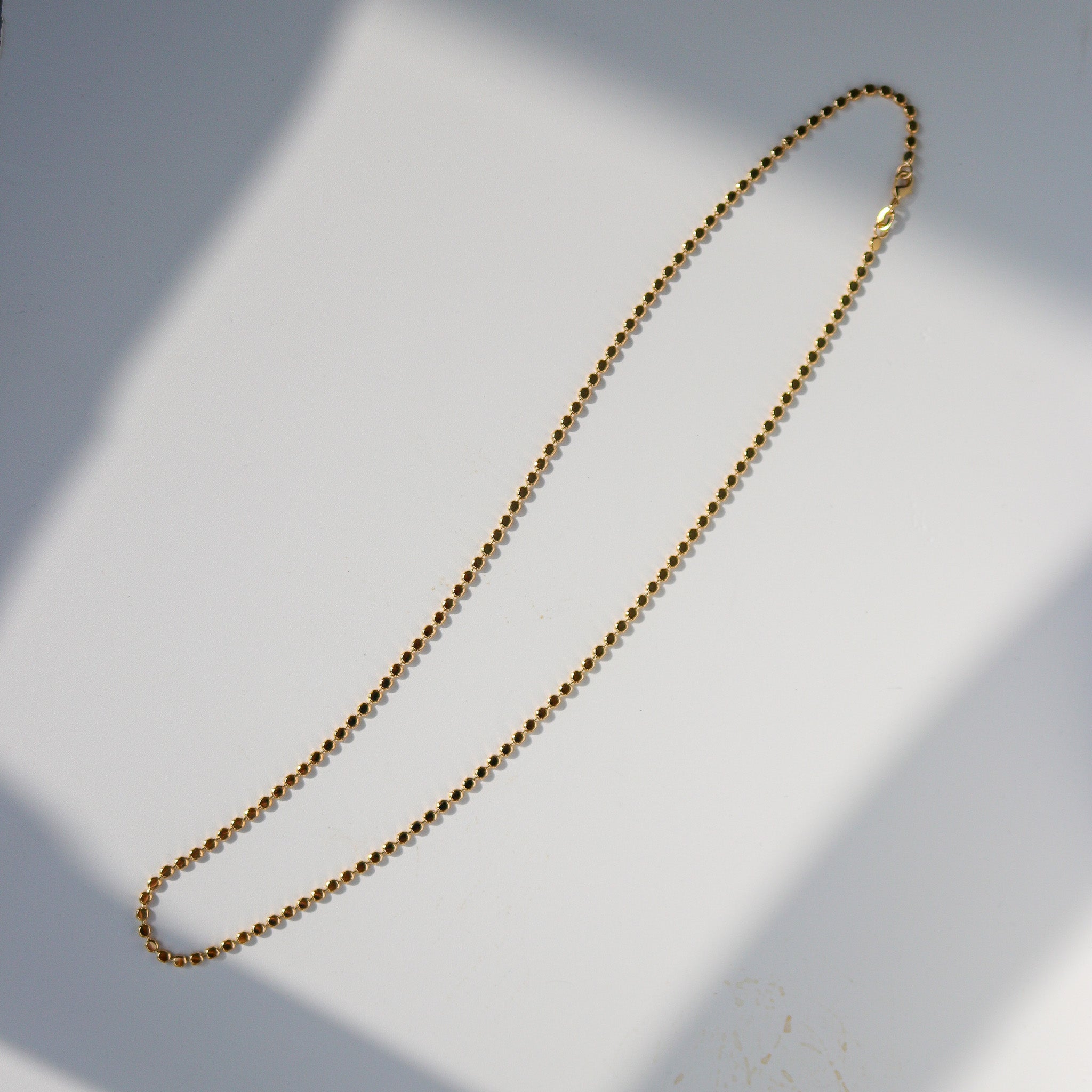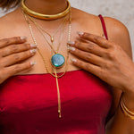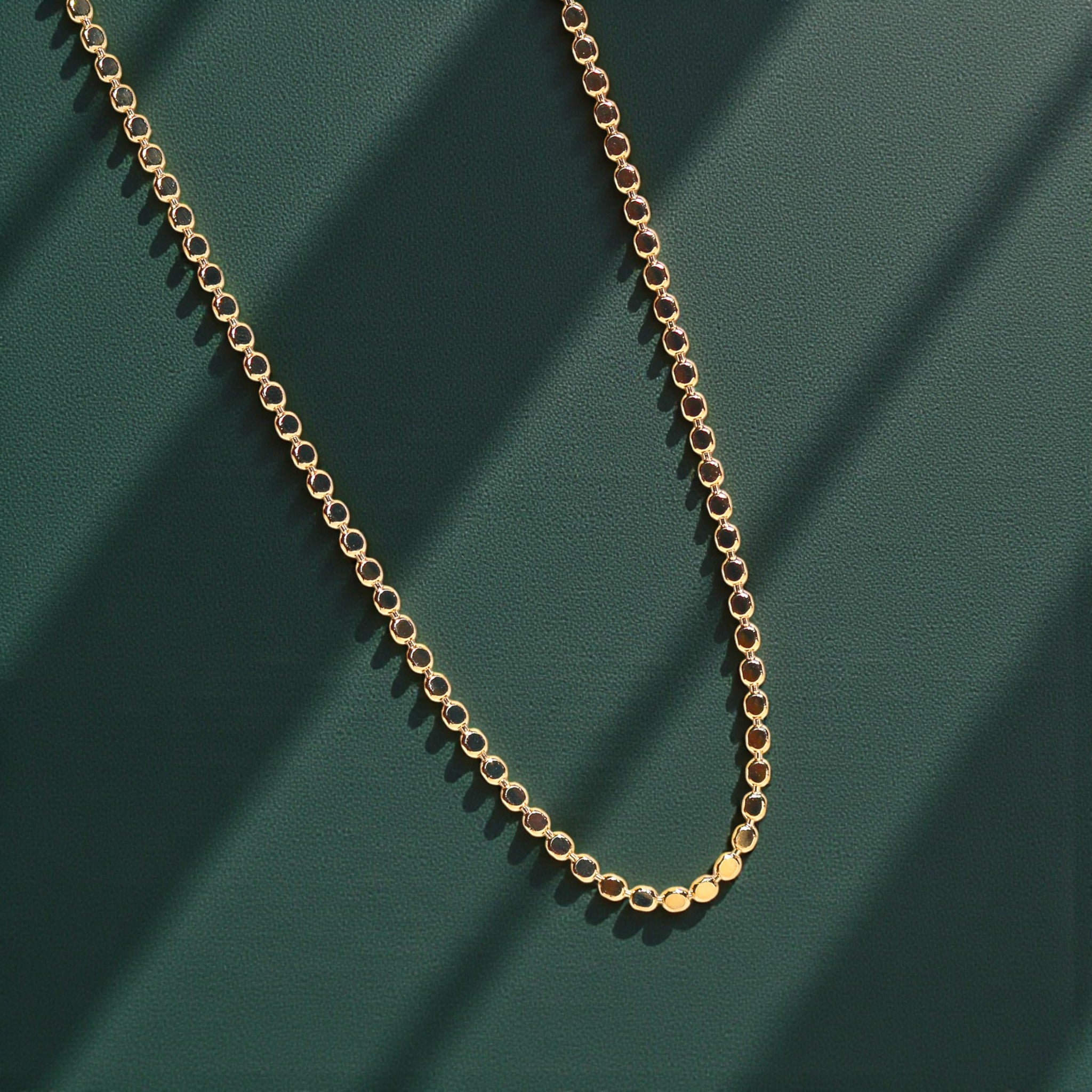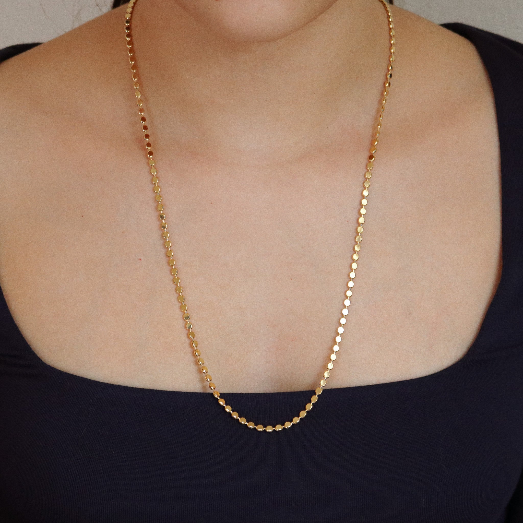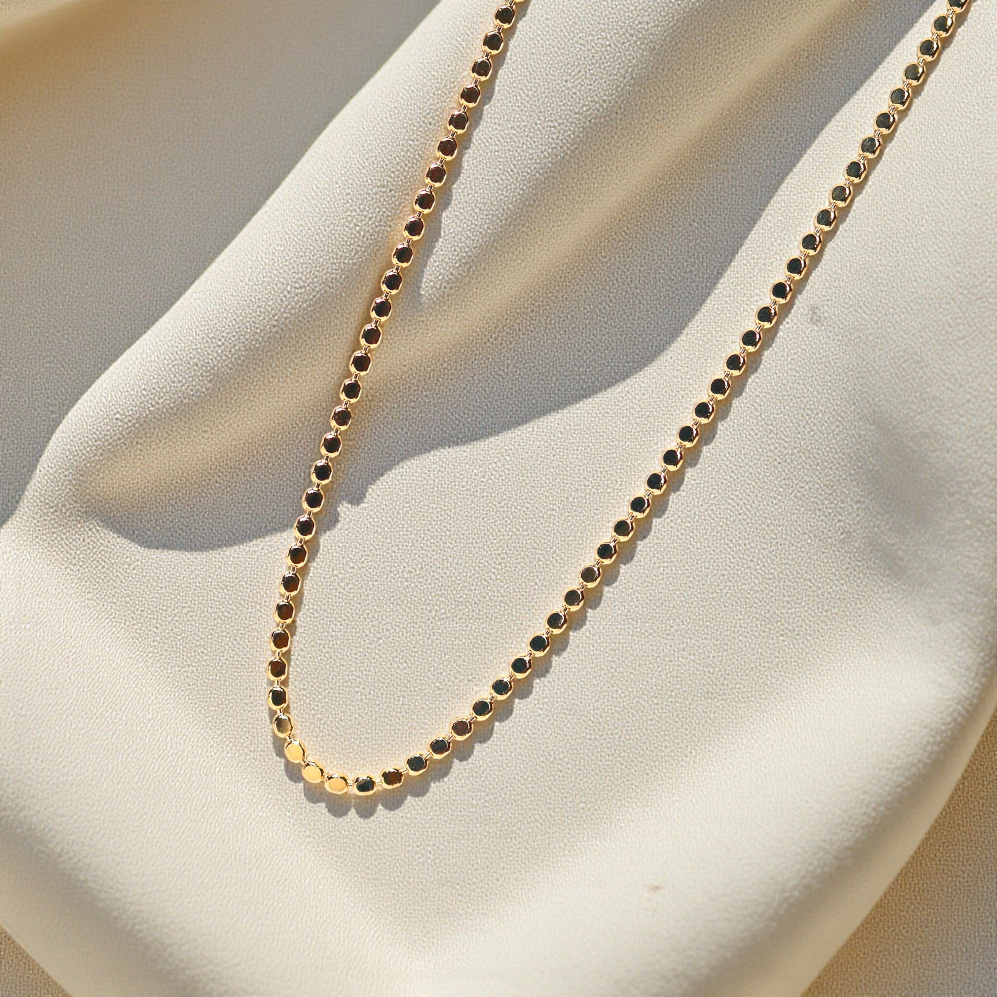 Delicate, luminous, and endlessly wearable. The Anikka Necklace features a long gold chain adorned with tiny golden discs that catch the light with every movement. Designed to layer effortlessly or shine on its own, this piece brings quiet elegance to everyday styling.