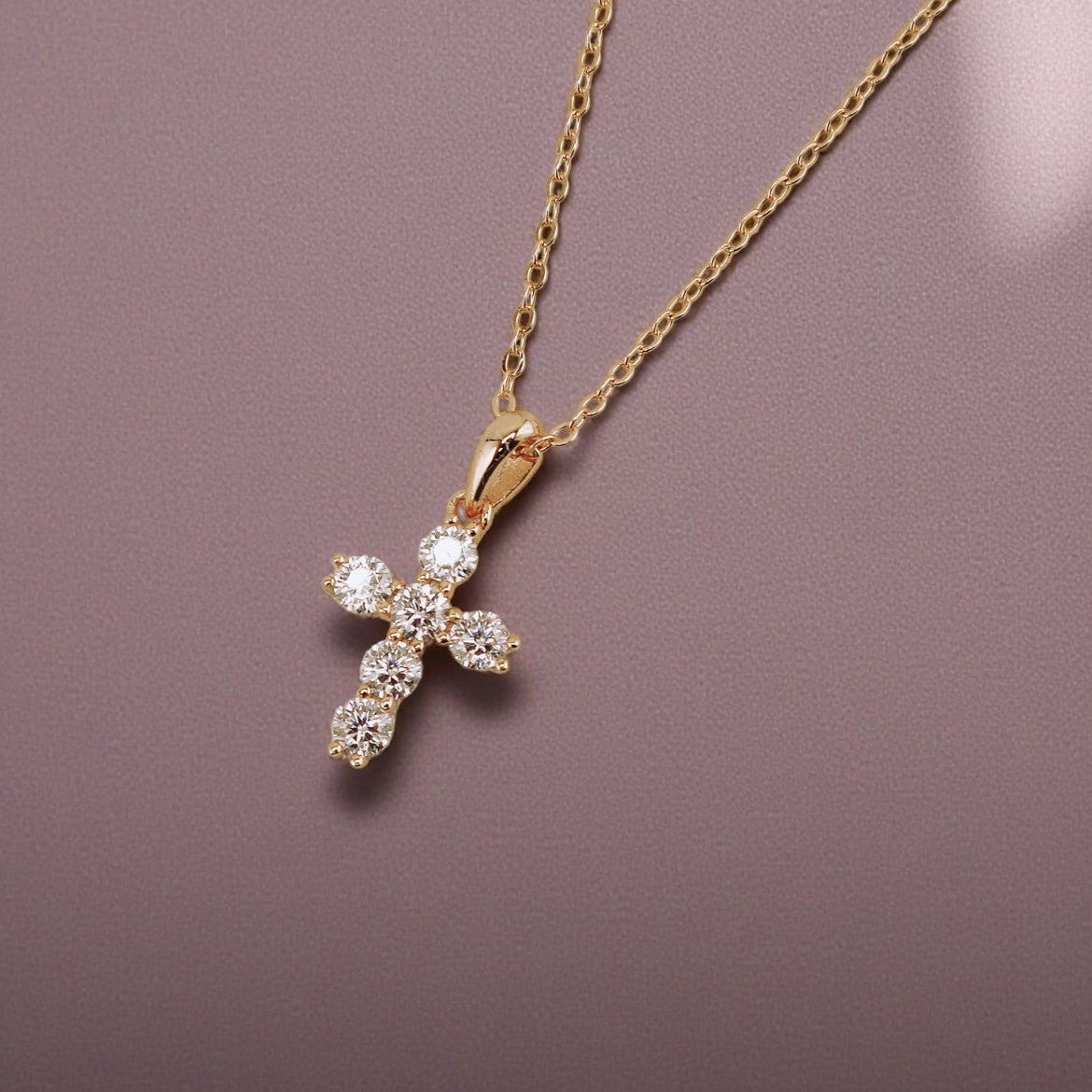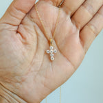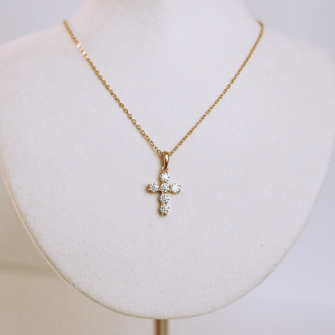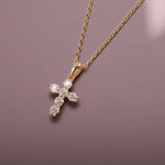 A delicate symbol of light and grace. The Auriel Cross shimmers with fine, hand-set stones that catch the light with every movement - small, refined, and endlessly sparkly.