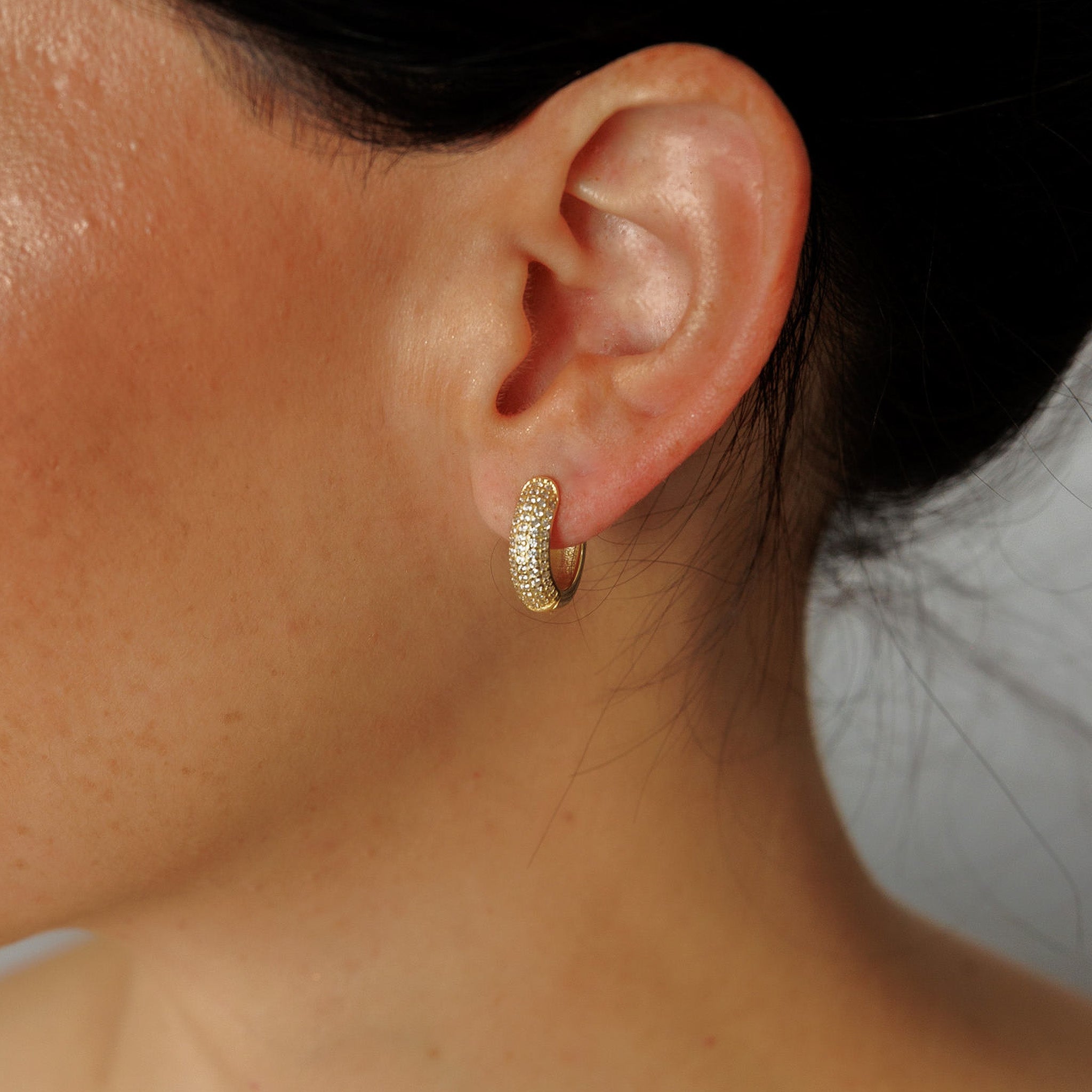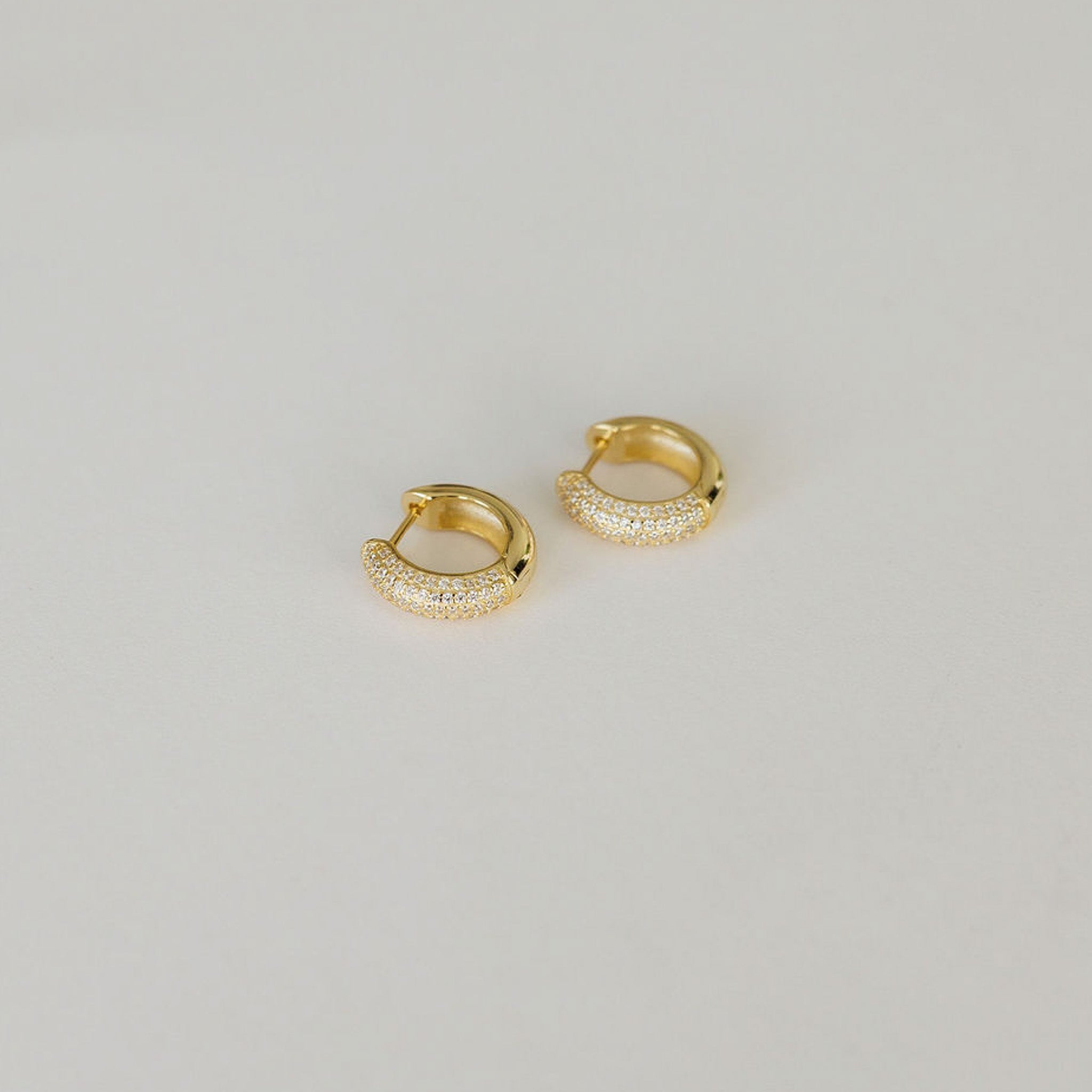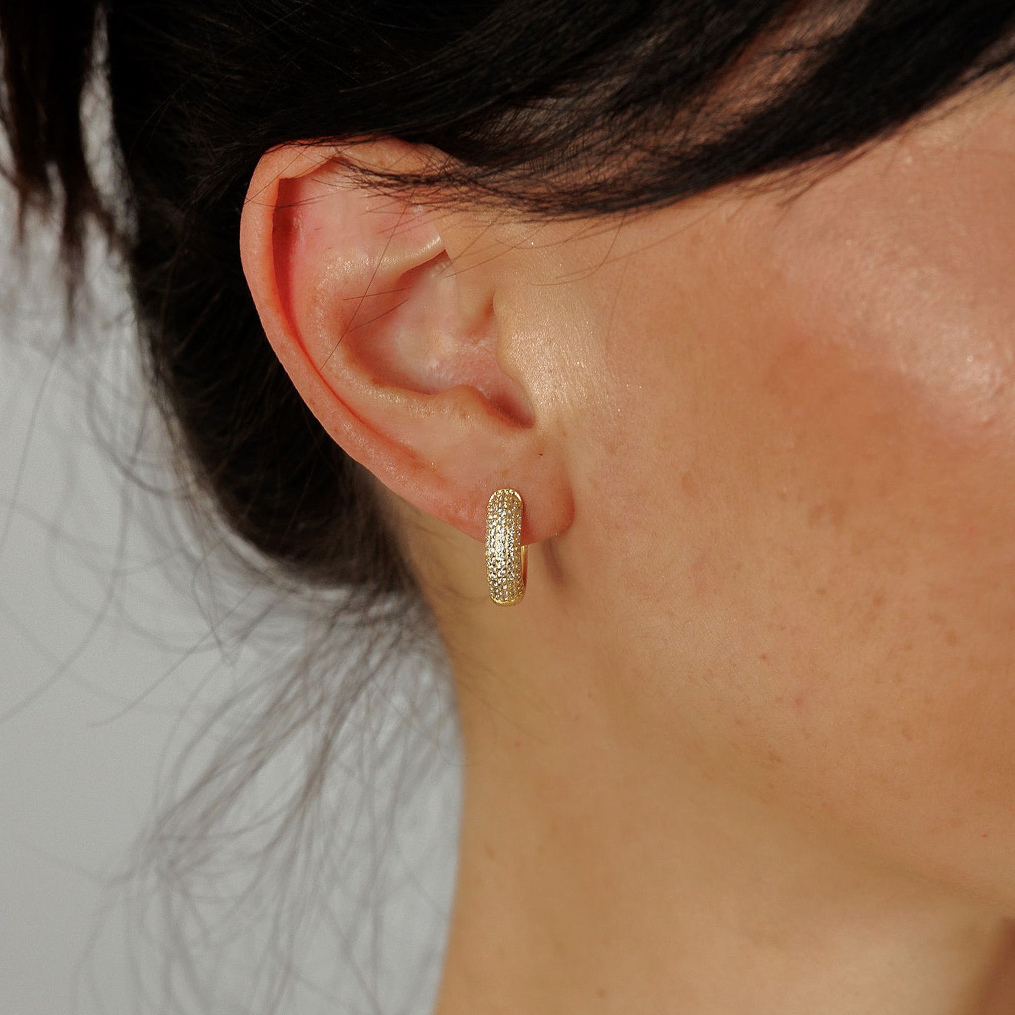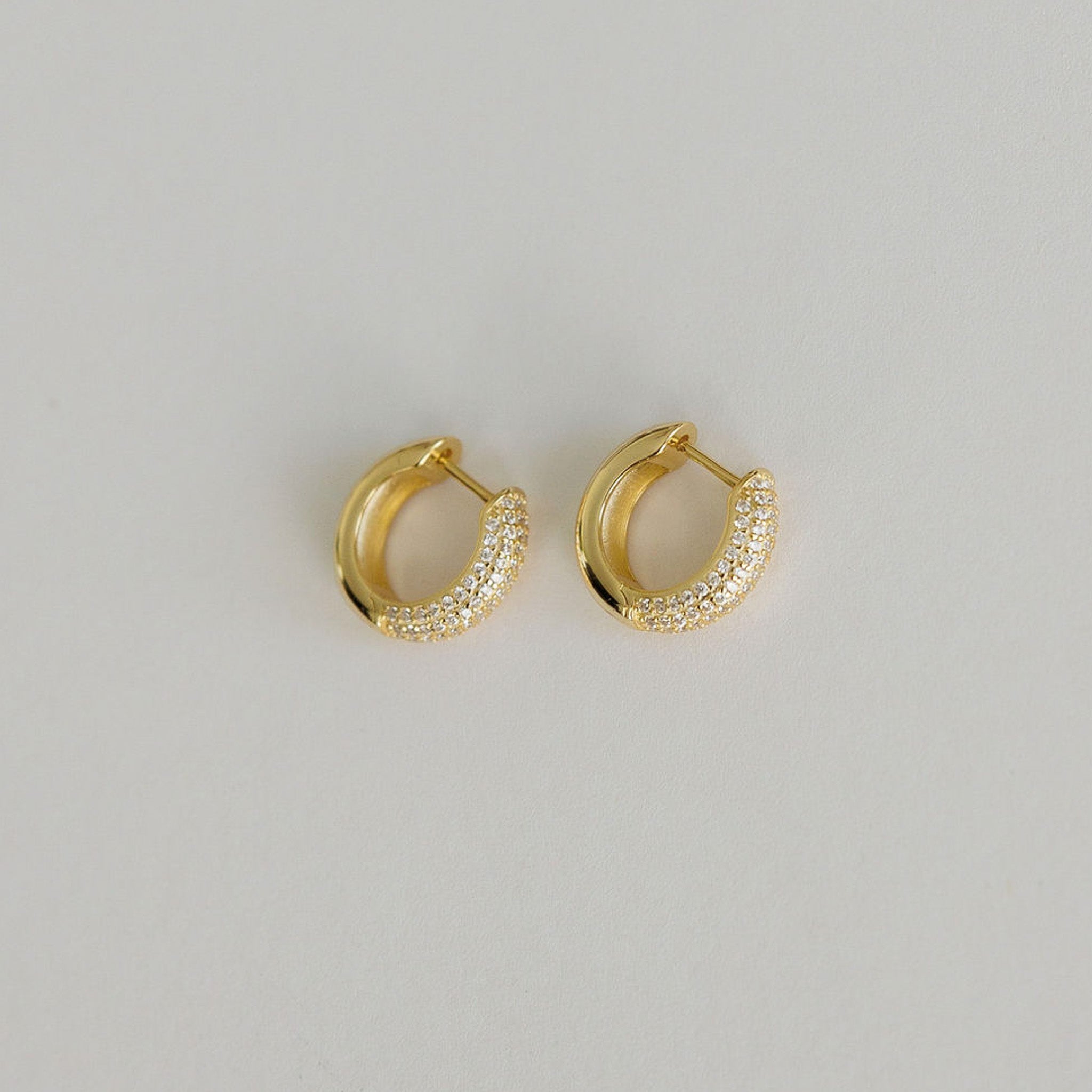 These dainty huggies click close with ease and shimmer with pavé-set stones - designed for everyday glow. Lightweight, luminous, and effortless to stack or wear solo.