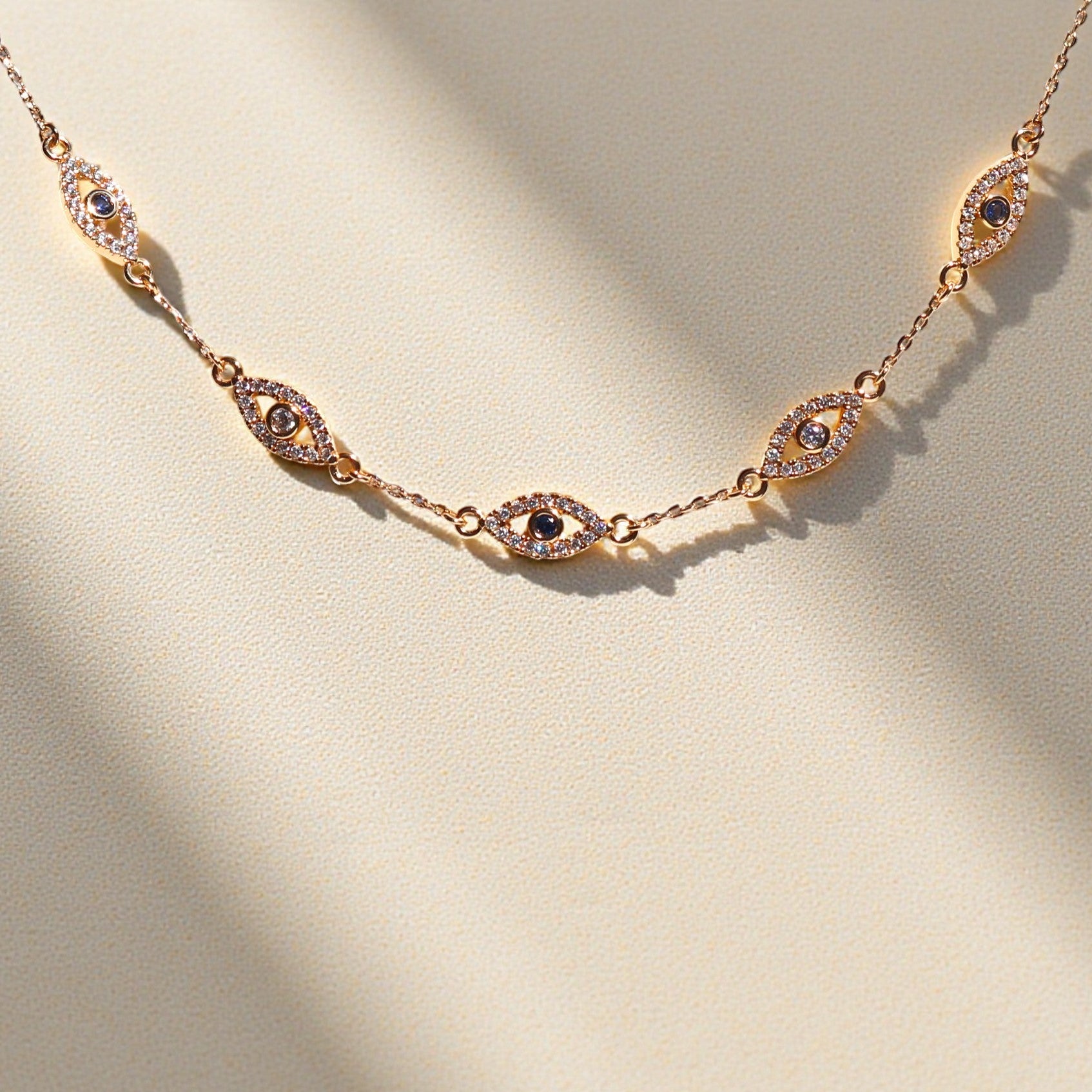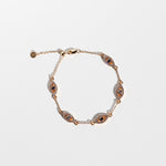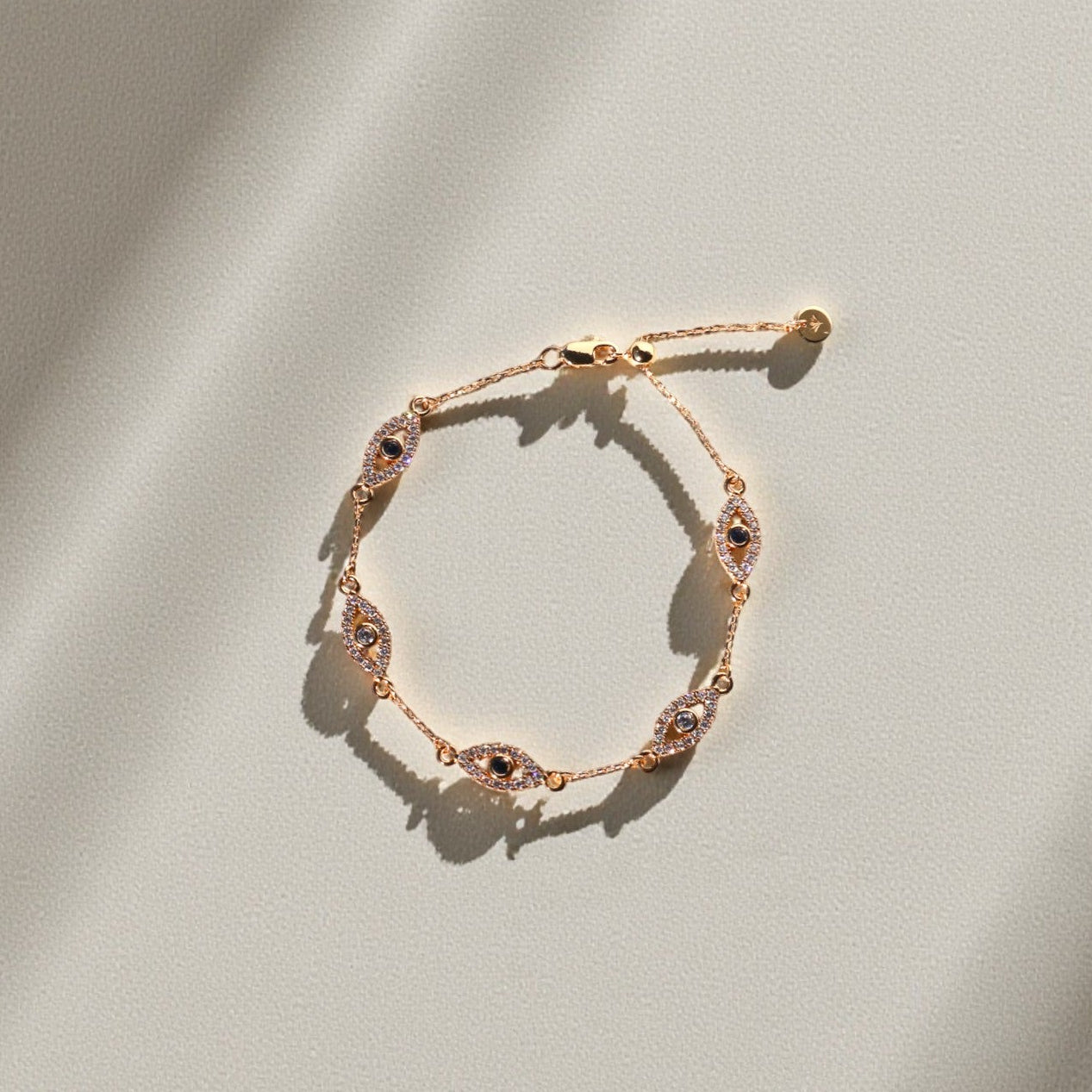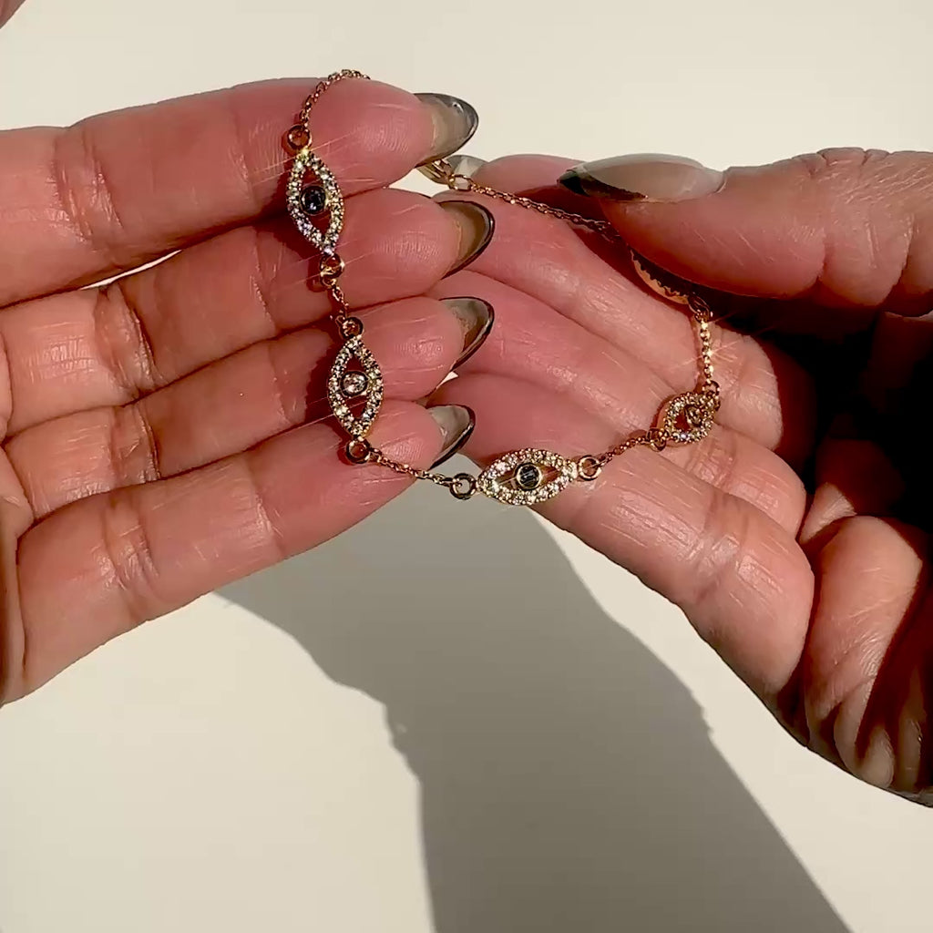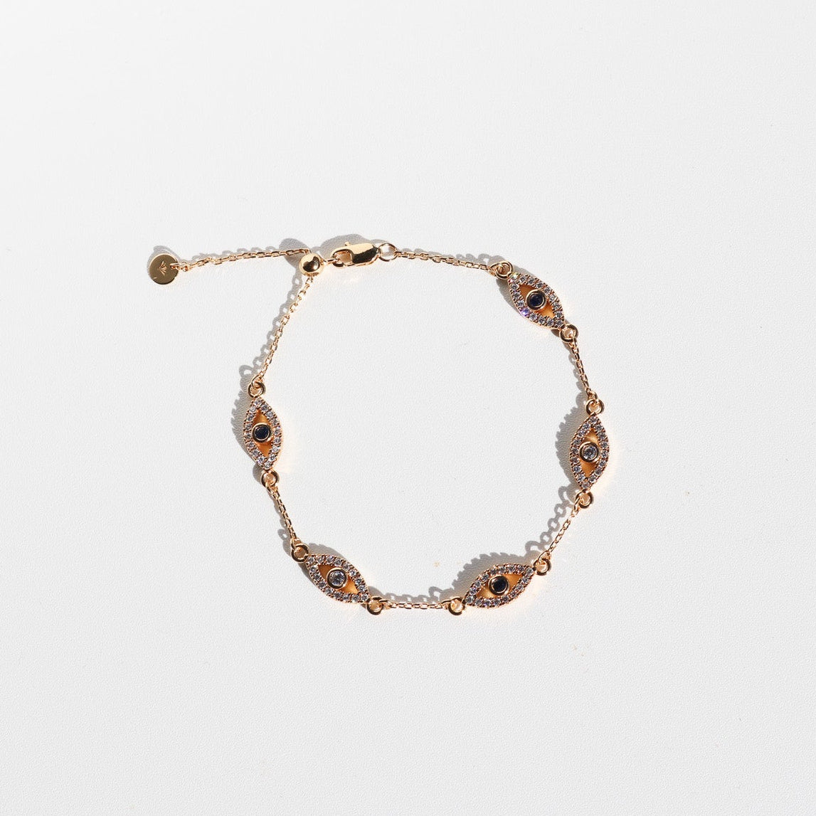 A dainty Evil Eye bracelet featuring alternating blue and white stones for a subtle shimmer and symbolic protection. Finished with an adjustable clasp for the perfect fit, every time. Medium-weight bracelet with a substantial, luxurious feel.
