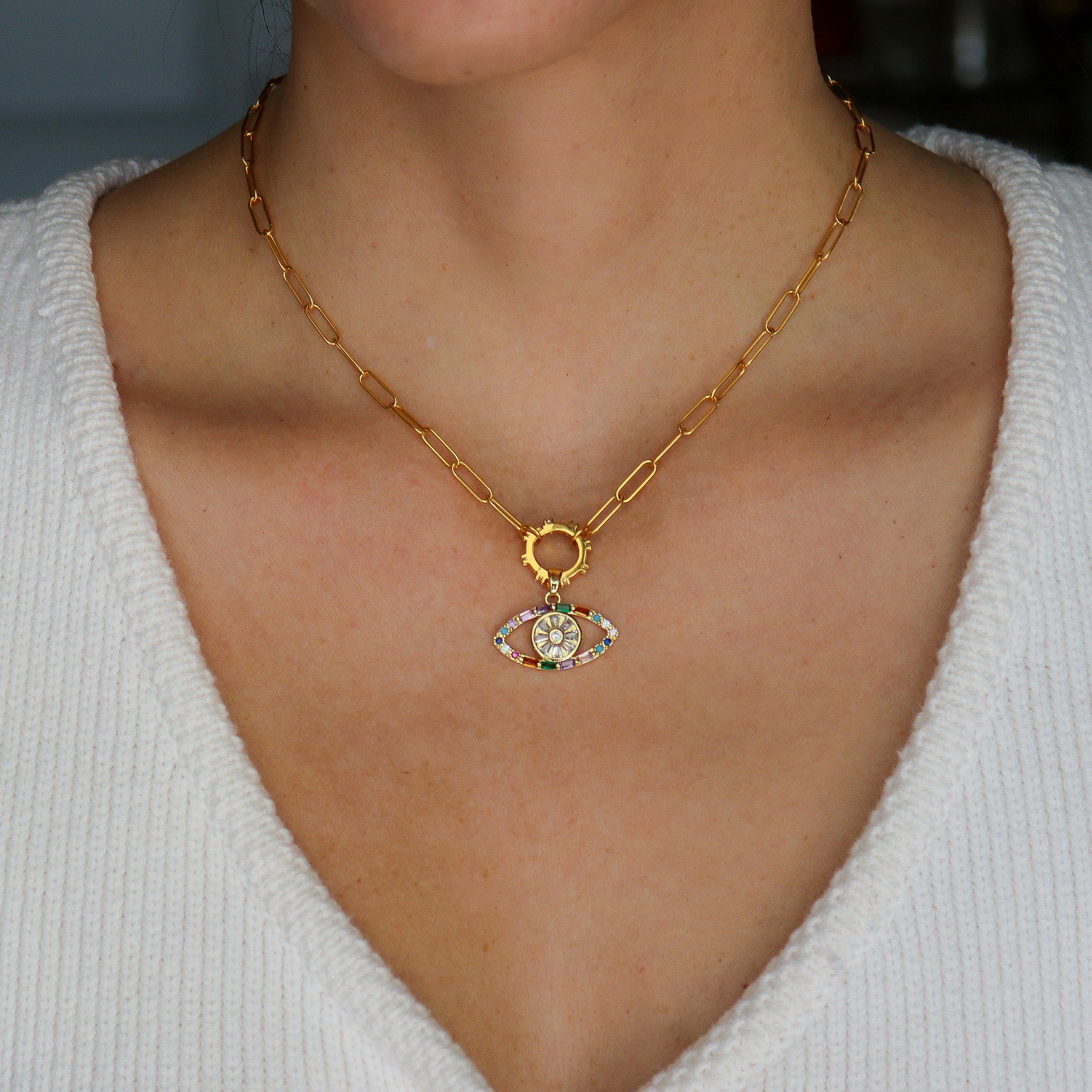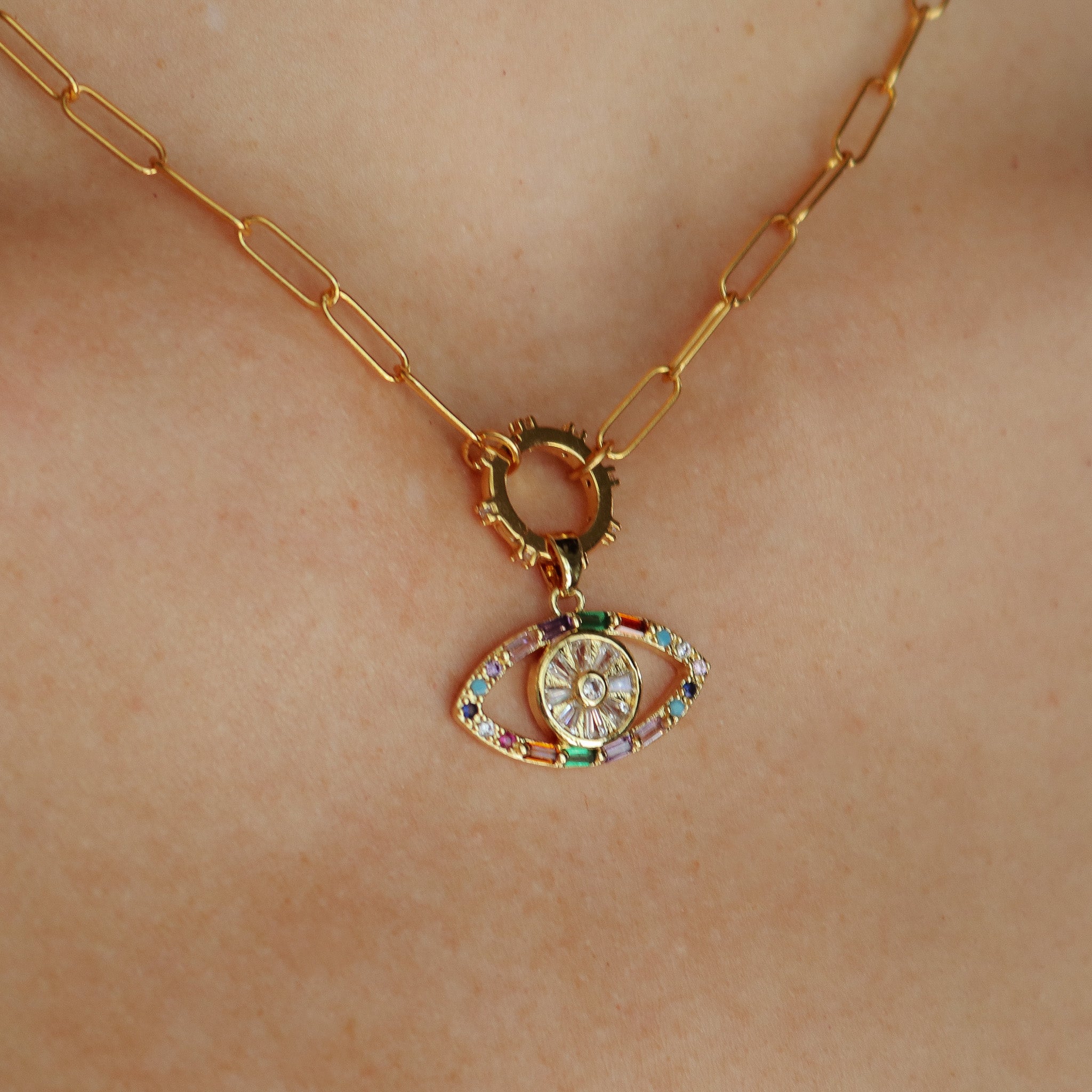 Protect yourself in style with a vibrant multicolor evil eye charm. Set in a pure 18k gold-filled setting, this charm combines colorful stones to ward off negativity while exuding timeless elegance and positive energy.