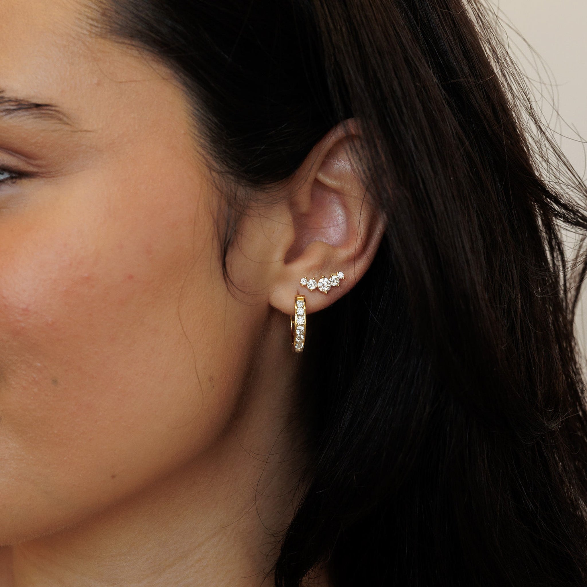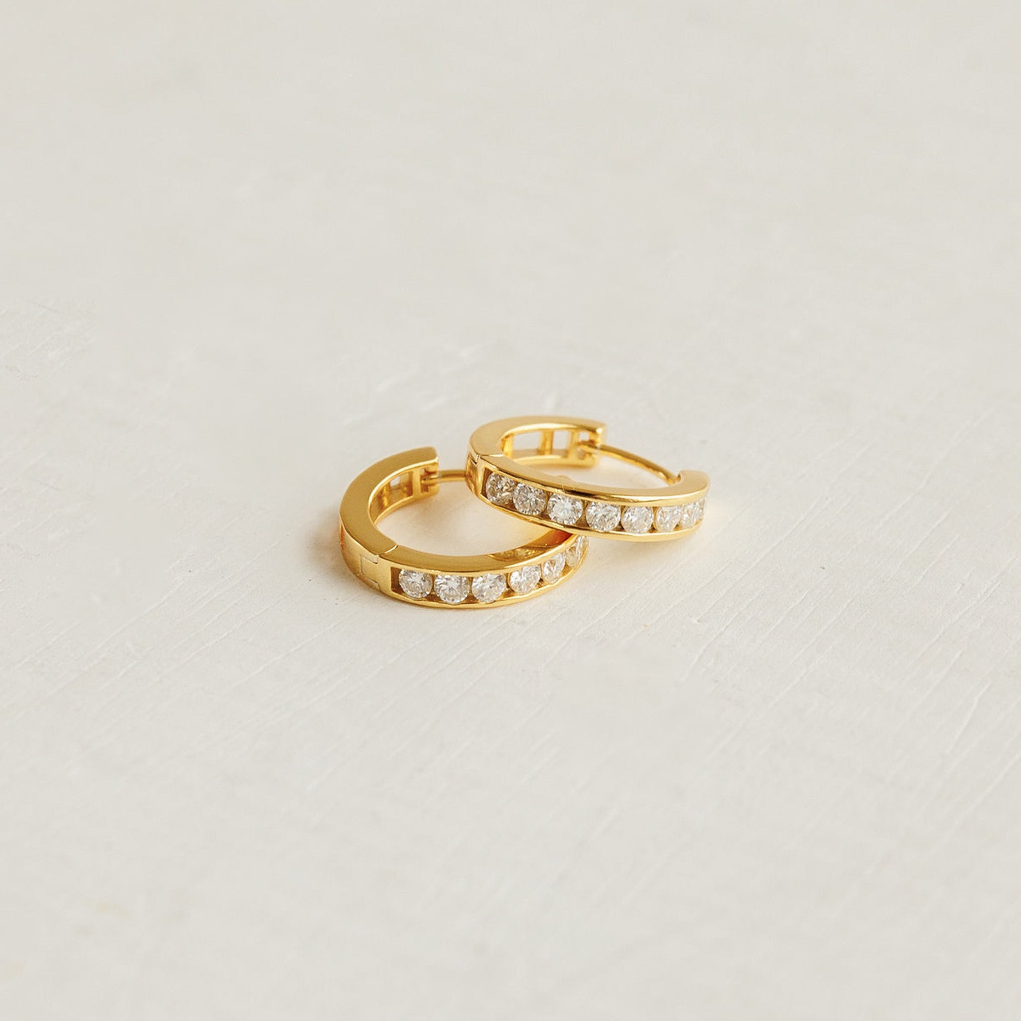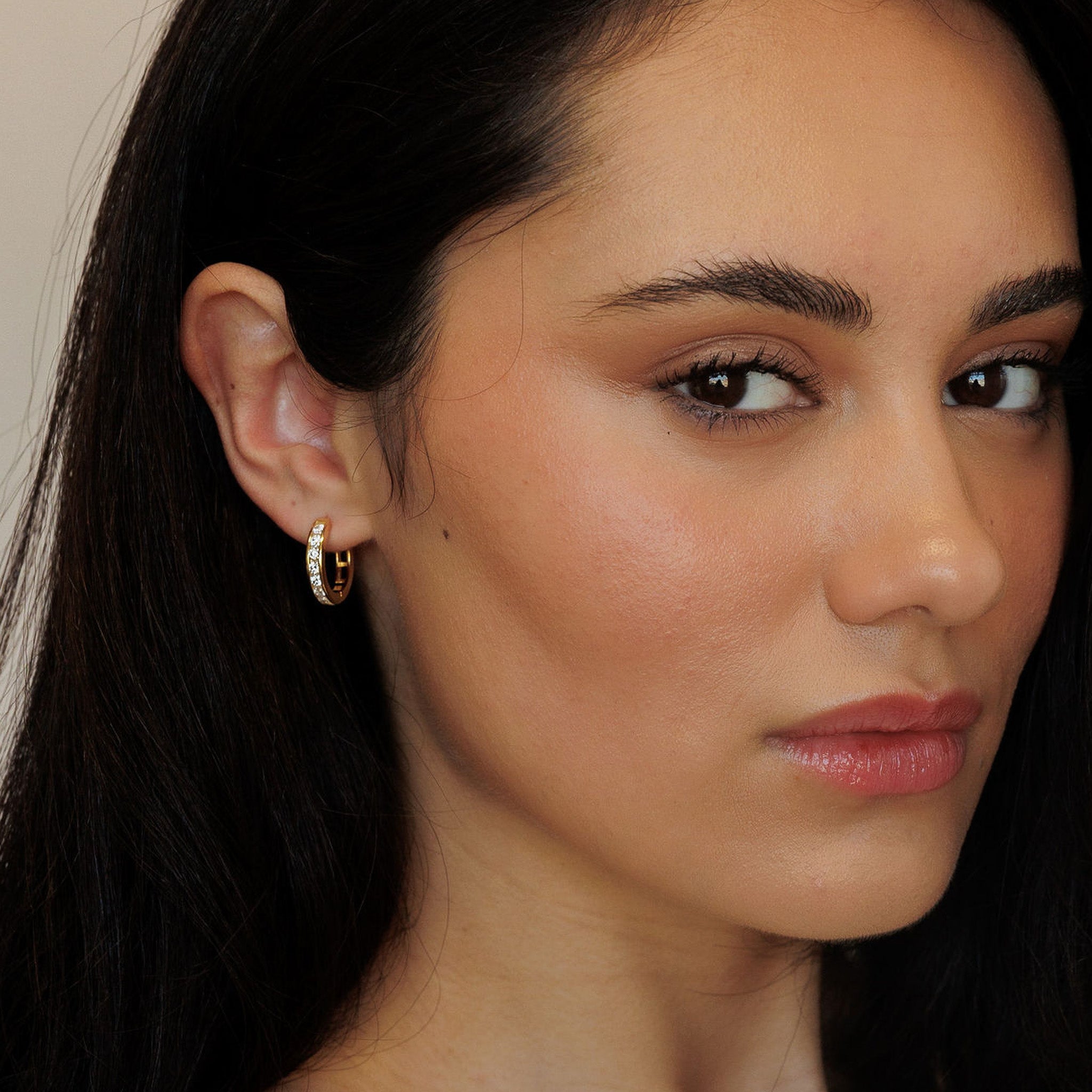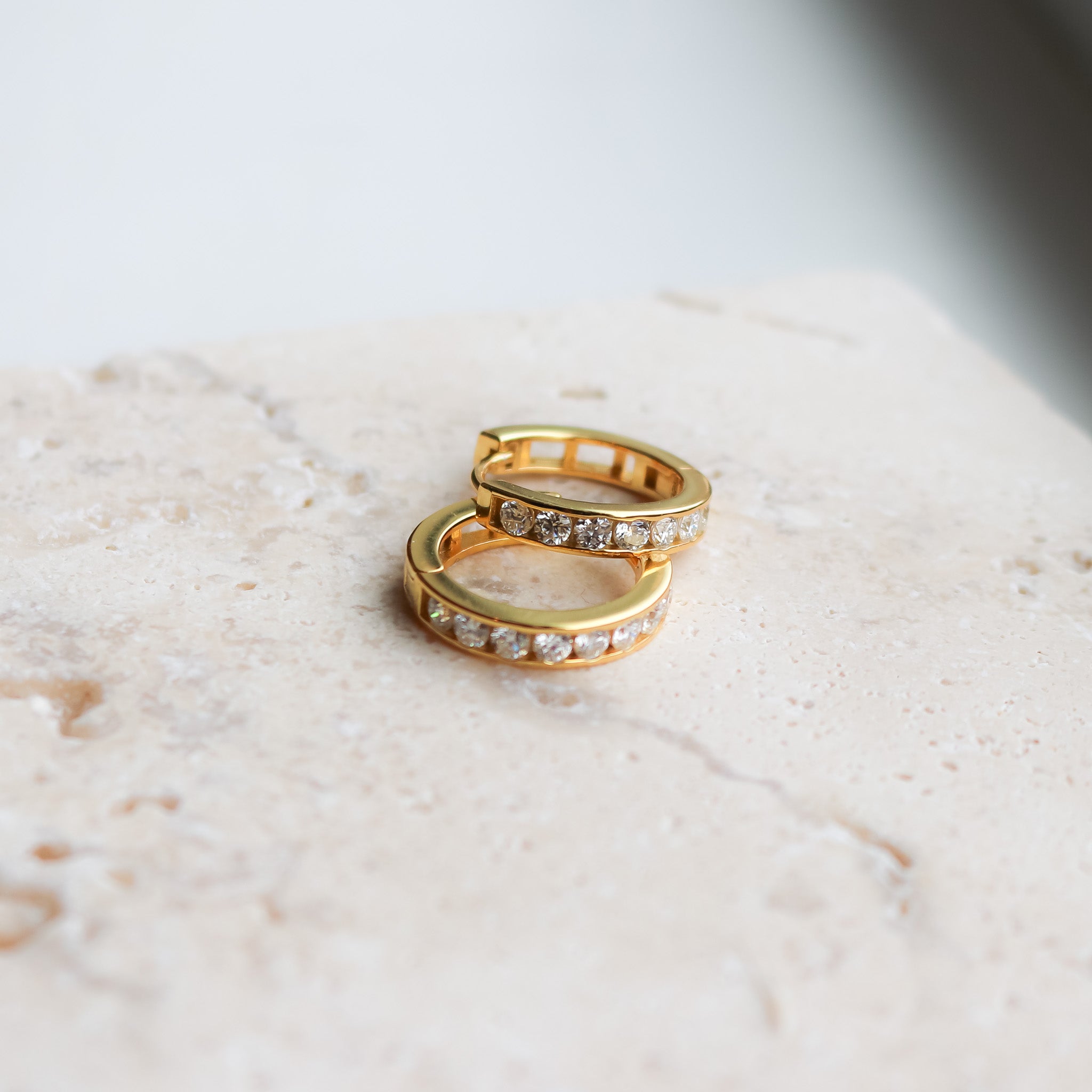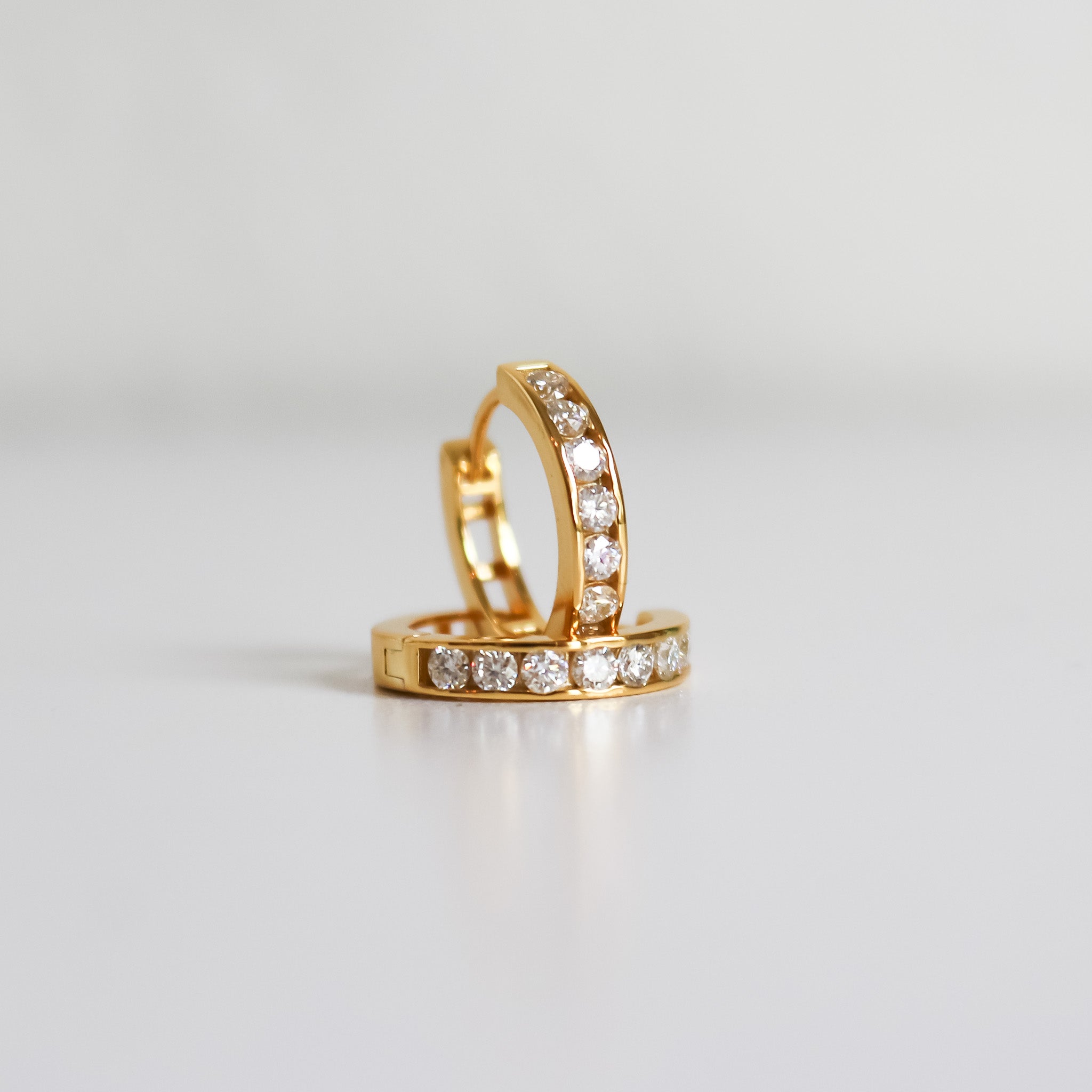 Medium size hoops that feature a row of dazzling moissanite stones in a sleek channel setting. Perfectly lightweight and versatile, these huggies shine brilliantly, making them ideal for everyday wear or adding a subtle sparkle to special occasions.