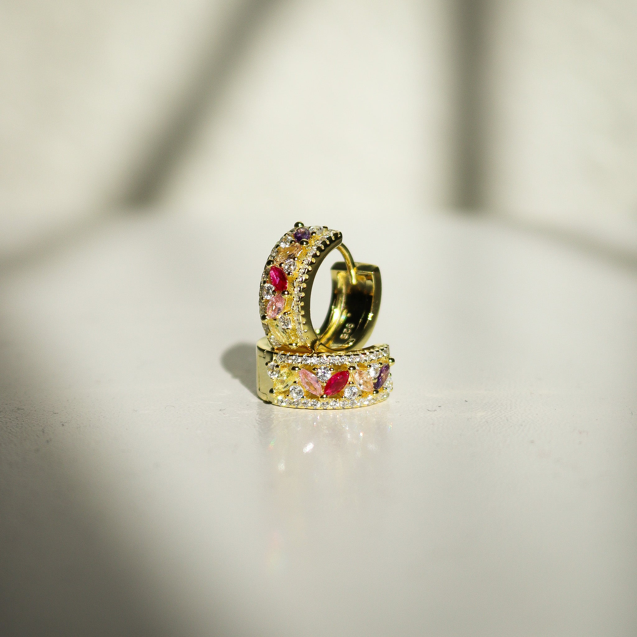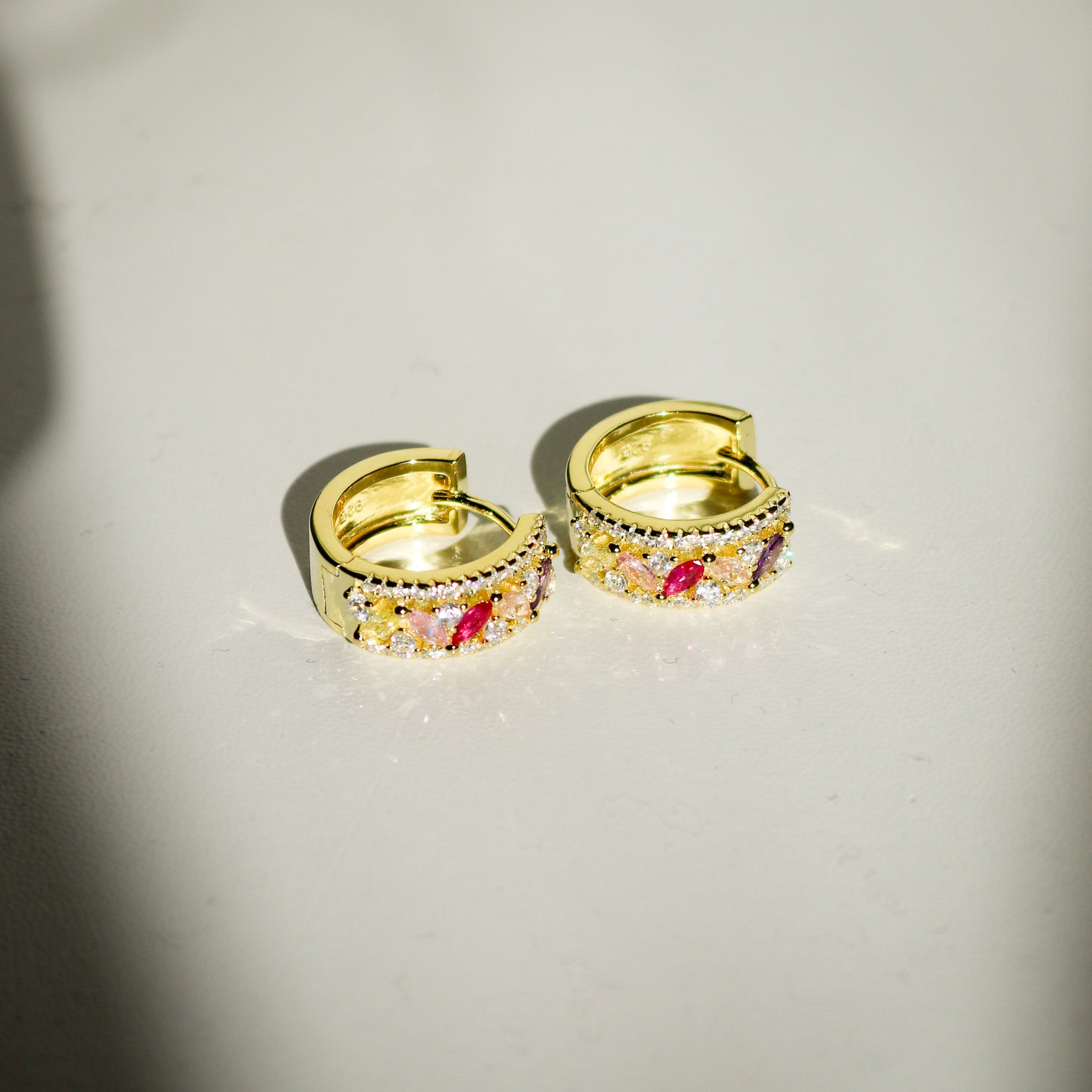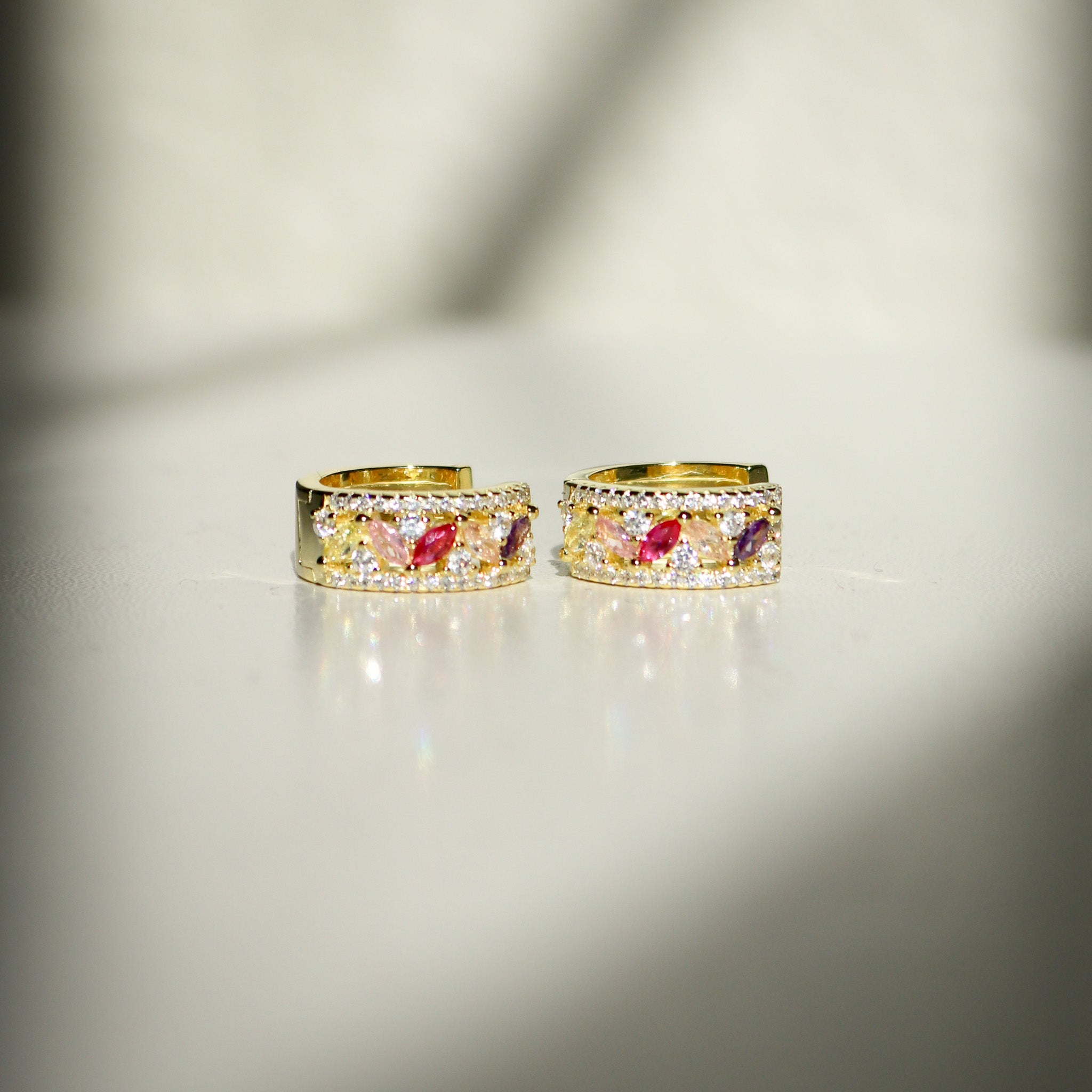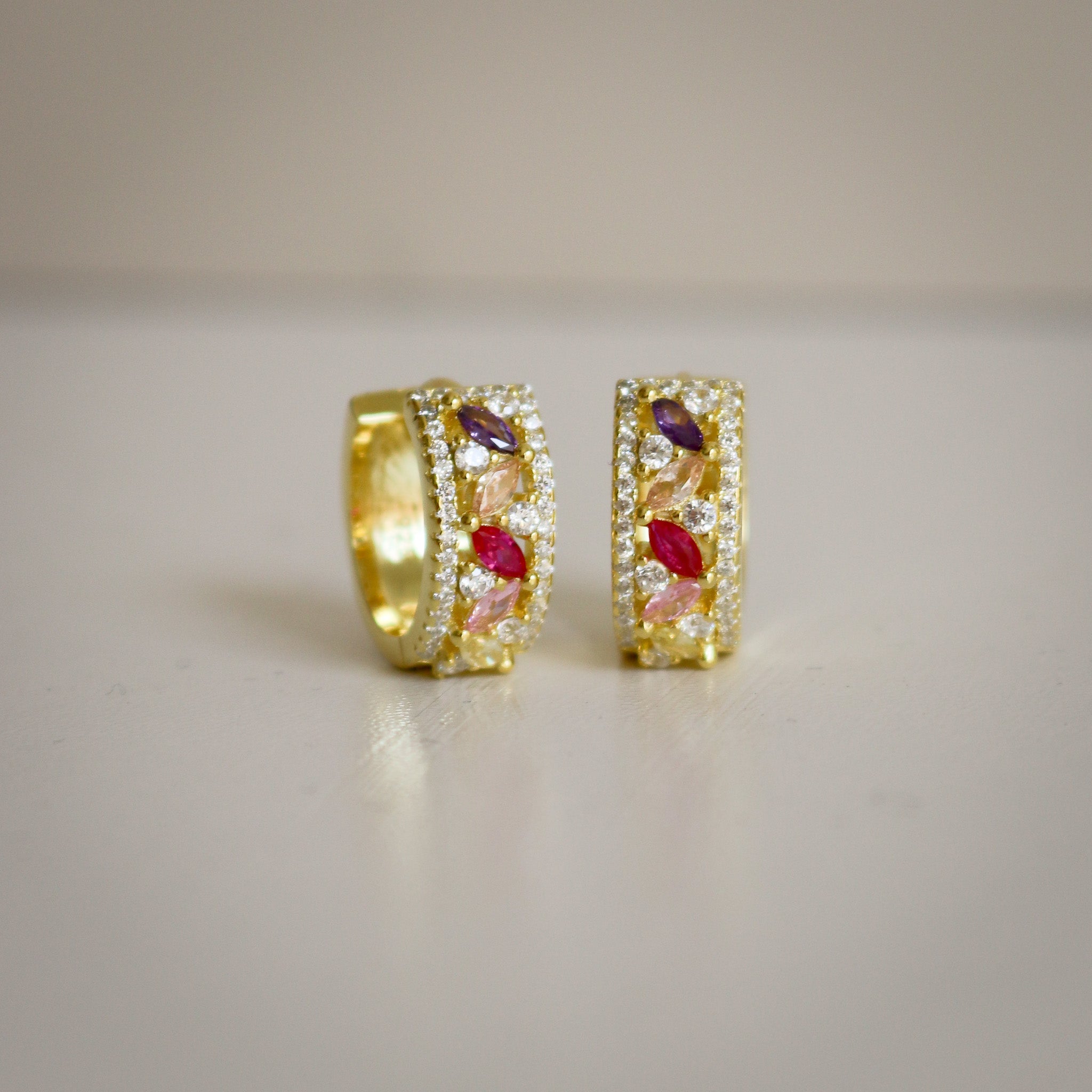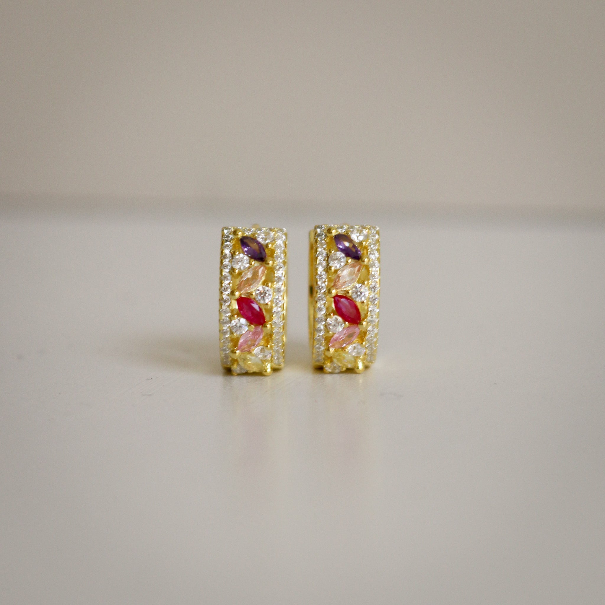 Dainty yet dazzling earrings feature a harmonious blend of vibrant colored stones and radiant diamonds, Hand-set to perfection.