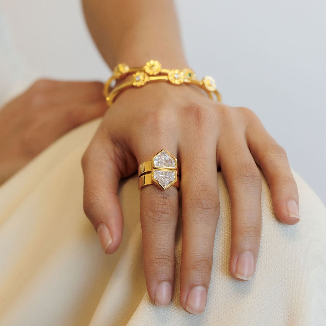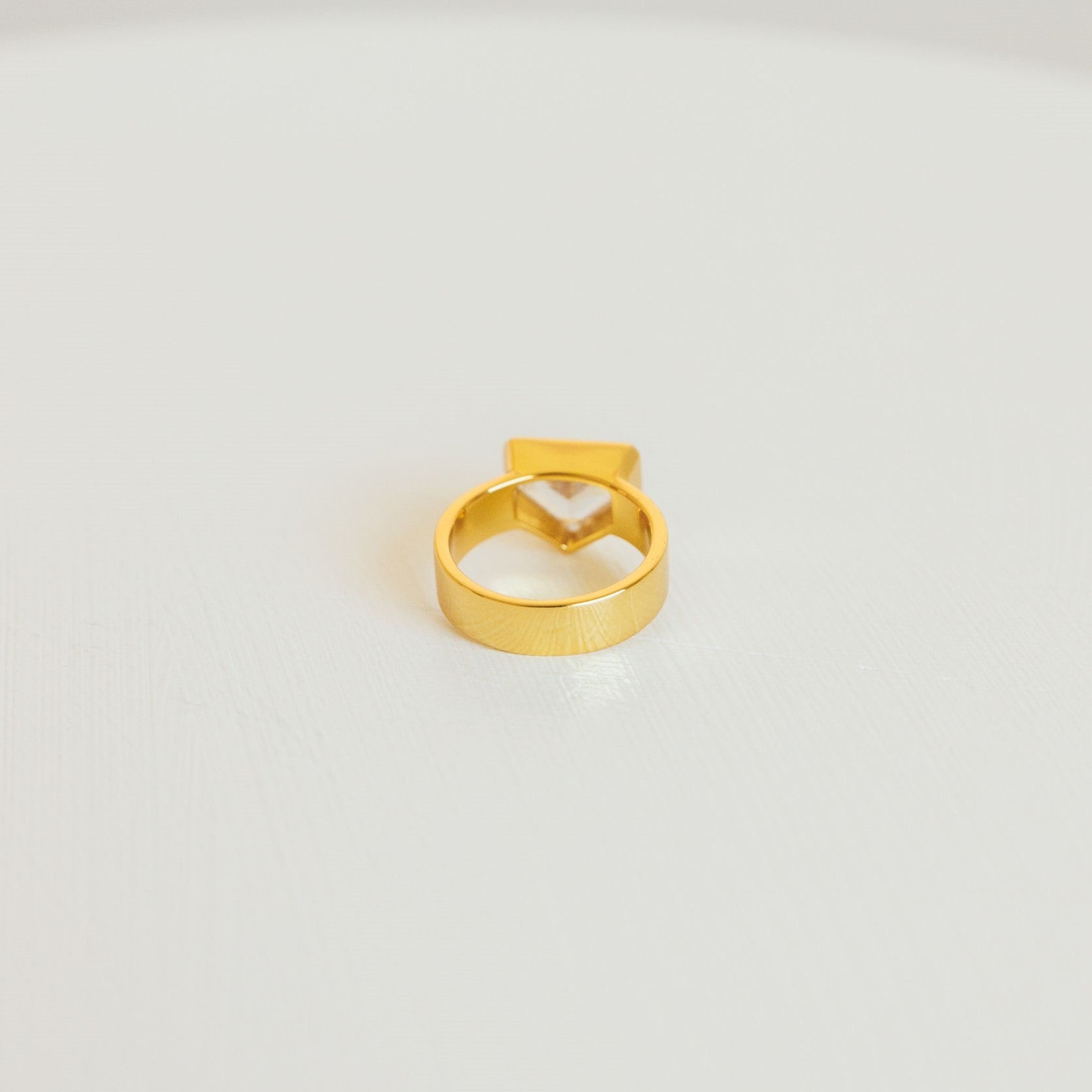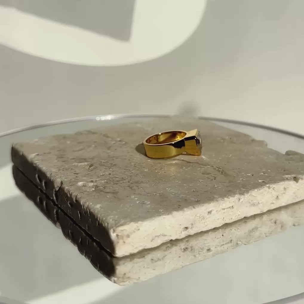 The Tara Ring is a statement in every way. Featuring a striking triangle-cut stone set in a bold, sculptural band, this piece is designed to command attention. Inspired by the Sanskrit word for “star,” Tara symbolizes strength, brilliance, and divine energy.