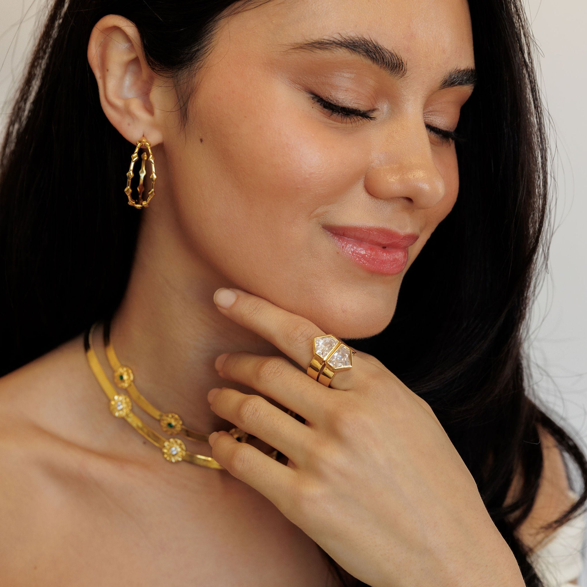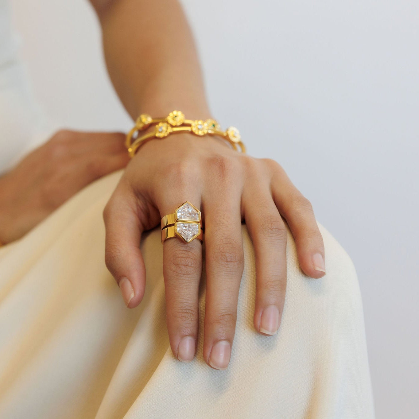 Featuring a striking triangle-cut stone set in a bold, sculptural band, this piece is designed to command attention. Inspired by the Sanskrit word for “star,” Tara symbolizes strength, brilliance, and divine energy.