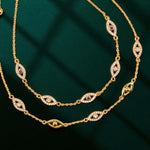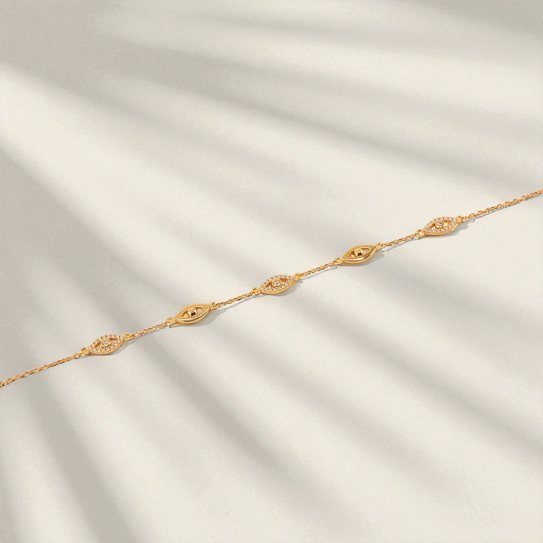 A dainty Evil Eye bracelet featuring alternating solid gold and diamond evil eye pendants for a subtle shimmer and symbolic protection. Finished with an adjustable clasp for the perfect fit, every time.