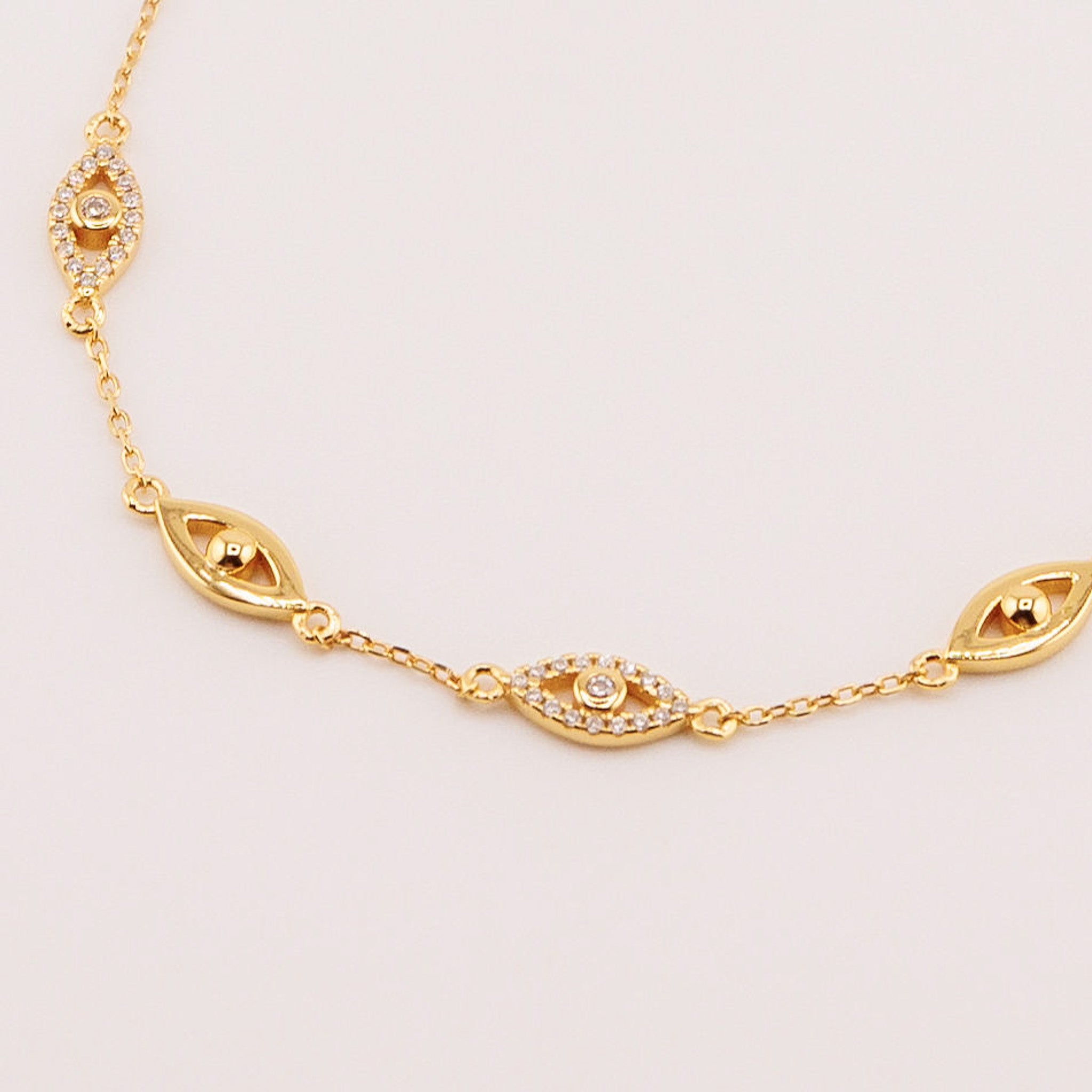 A dainty Evil Eye bracelet featuring alternating solid gold and diamond evil eye pendants for a subtle shimmer and symbolic protection. Finished with an adjustable clasp for the perfect fit, every time.